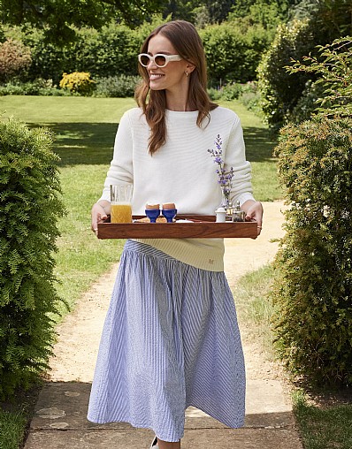 The Laurie cotton jumper. In a lovely shade of ivory, this easy-to-wear design is super soft and comfy, with an all-over textured knit and roll-edge neckline. The jumper is complete with our crossed oars embroidery - a mark of quality and style. Pair with jeans or tailored trousers - this knit deserves a spot in your wardrobe.