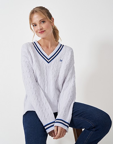 A cricket jumper in white and blue. Now designed in a relaxed fit, this is perfect for laidback days. Featuring classic cable stitching, contrast tipping and cosy ribbed hems. As the perfect finishing touch, we've added our crossed oars, neatly found embroidered on the chest. Style with jeans for a look taken straight from the varsity archives.
