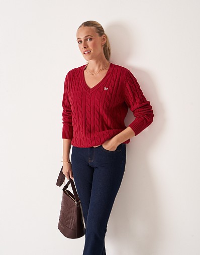V Neck Chunky Heritage Cable Jumper in Red