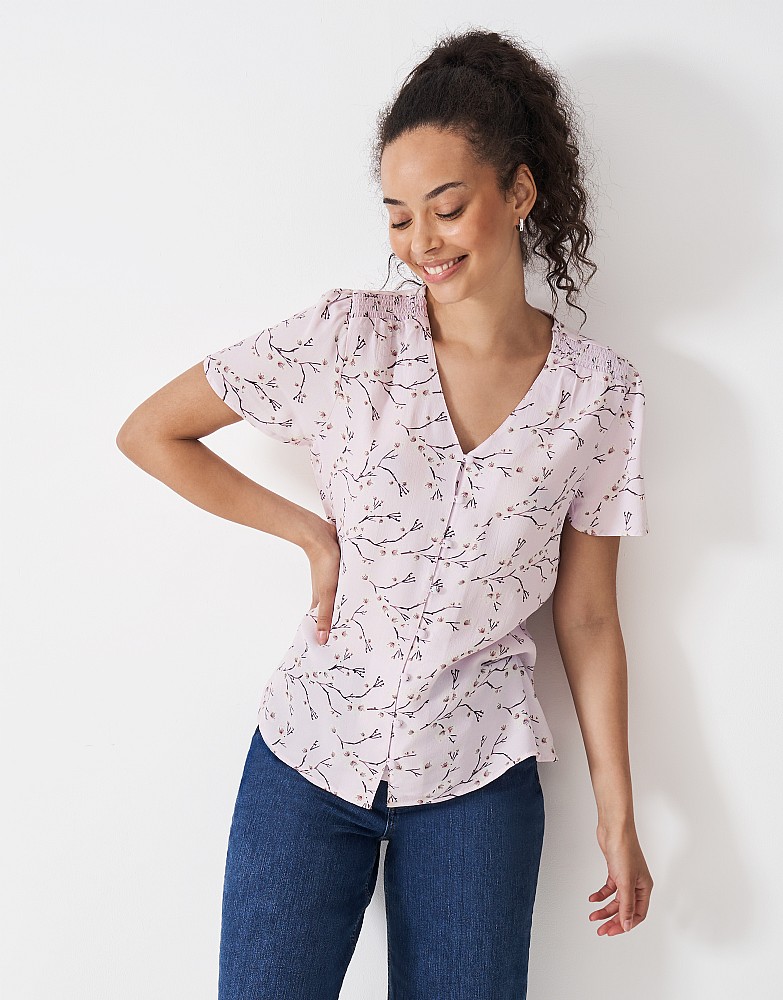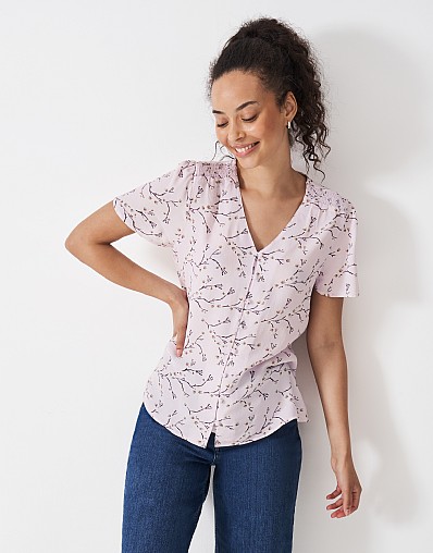 The Erin floral blouse in pink, with our cherry blossom print. Crafted from soft, slinky fabric and styled with a tie-up detail to secure on the back, this little number is designed to be both comfortable and flattering. We love the neat fabric-covered buttons, V-neckline and shirring on the shoulders, too. It's the perfect way to add a fresh wash of colour to your summer wardrobe.