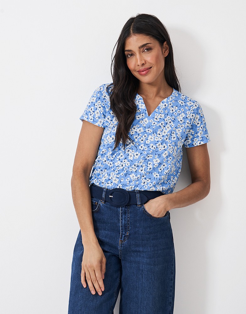Cotton Slub Notch Neck T-Shirt in Blue Ditsy Print