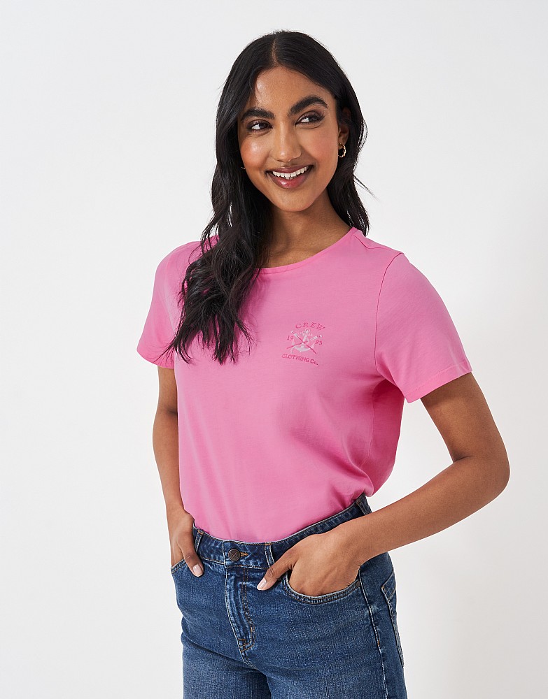 Our graphic slub tee in pink. Available in three colourways, this t-shirt is crafted from soft and slouchy slub fabric. It features new logo branding and an anchor design embroidered on the chest - an update to the classic round neck tee. Style effortlessly this summer with a pair of denim shorts and sandals.