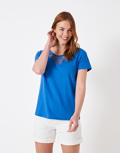 Our Iona top in bright blue. We love the simplicity of this tee, which features a round neckline and a lace detailed placket, adding an extra feminine touch to a staple style. Made from relaxed cotton slub, it’s perfect for wearing with jeans on days off.