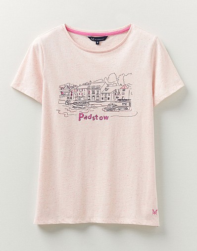 A pink t-shirt. A beautiful illustration of Padstow makes us want to wear this tee on a staycation. A pretty speckle and complementary pink details finish off the neatly.