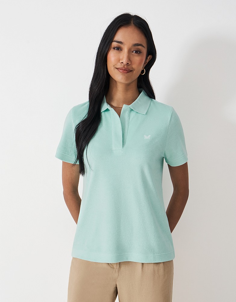Lovely navy towelling polo shirt,so comfortable and flattering.Slightly smaller in size ie half a size. Loved that was in the sale and have since ordered the surf blue(electric blue).Something a little different.