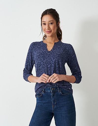 Our notch-neck top in navy. We've designed this long sleeve top from 100% viscose and in our house-drawn bird print. The perfect addition to your collection - wear with jeans for effortless styling.