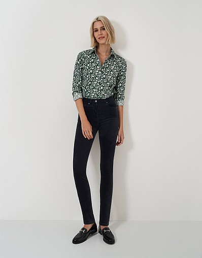 Velvet trousers in black. Cut for a skinny fit in a classic, five pocket style, these trousers are finished with a branded metal button and our crossed oars embroidered on the back pocket. Wear with a shirt for party season, or style more casually with a Breton.