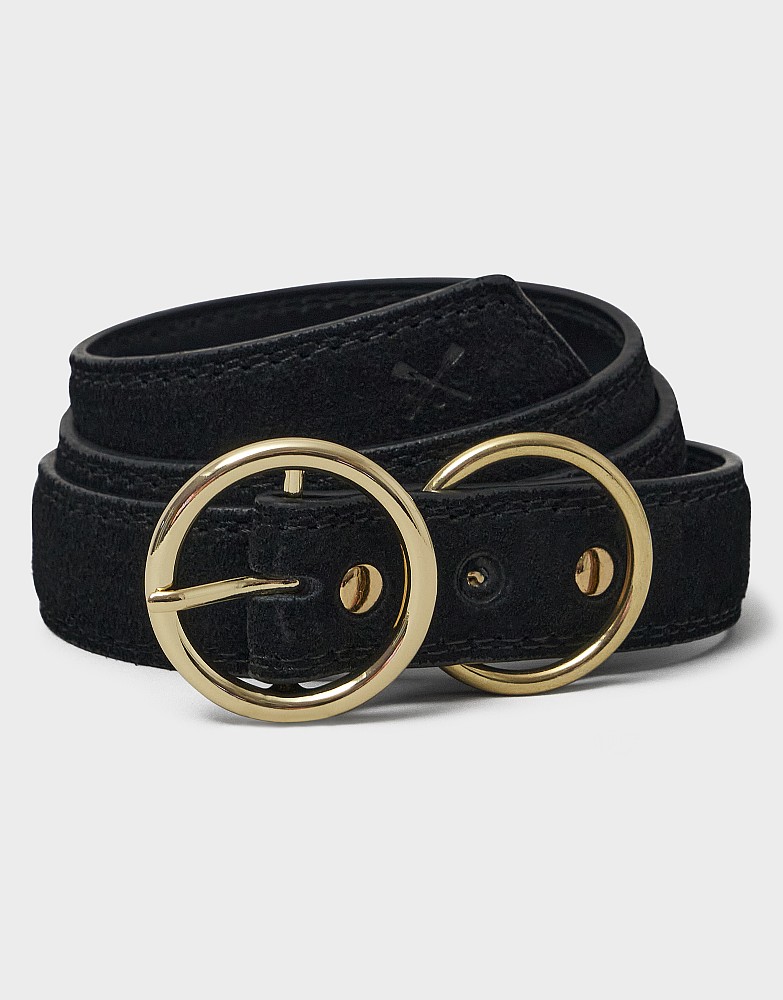 A suede-leather belt in black. Perfect for cinching in jeans and trousers, it's complete with a double-circle detail and a gold-tone buckle. Simple and sophisticated.