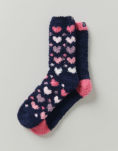 A two pack of fluffy socks in navy with pink and white hearts. Ever-so-soft and super cosy, treat your feet to these. You’ll never want to take them off.