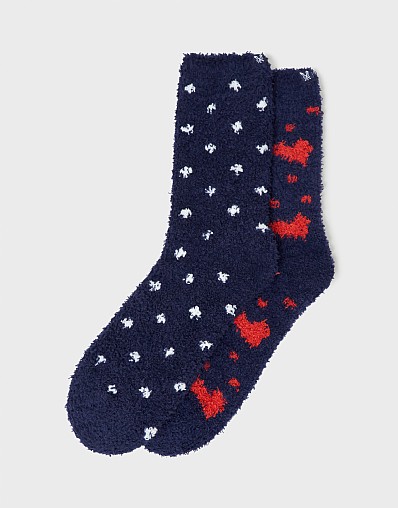 A two pack of fluffy socks in navy heart and navy spot print. Oh-so-soft, these socks are just the thing for cosy evenings at home. Just add your favourite pyjamas.