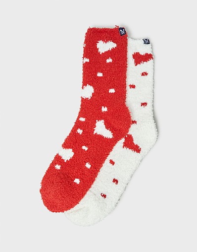 A two pack of fluffy socks in red and ivory with a heart print. Oh-so-soft, these socks are just the thing for cosy evenings at home. Just add your favourite pyjamas.